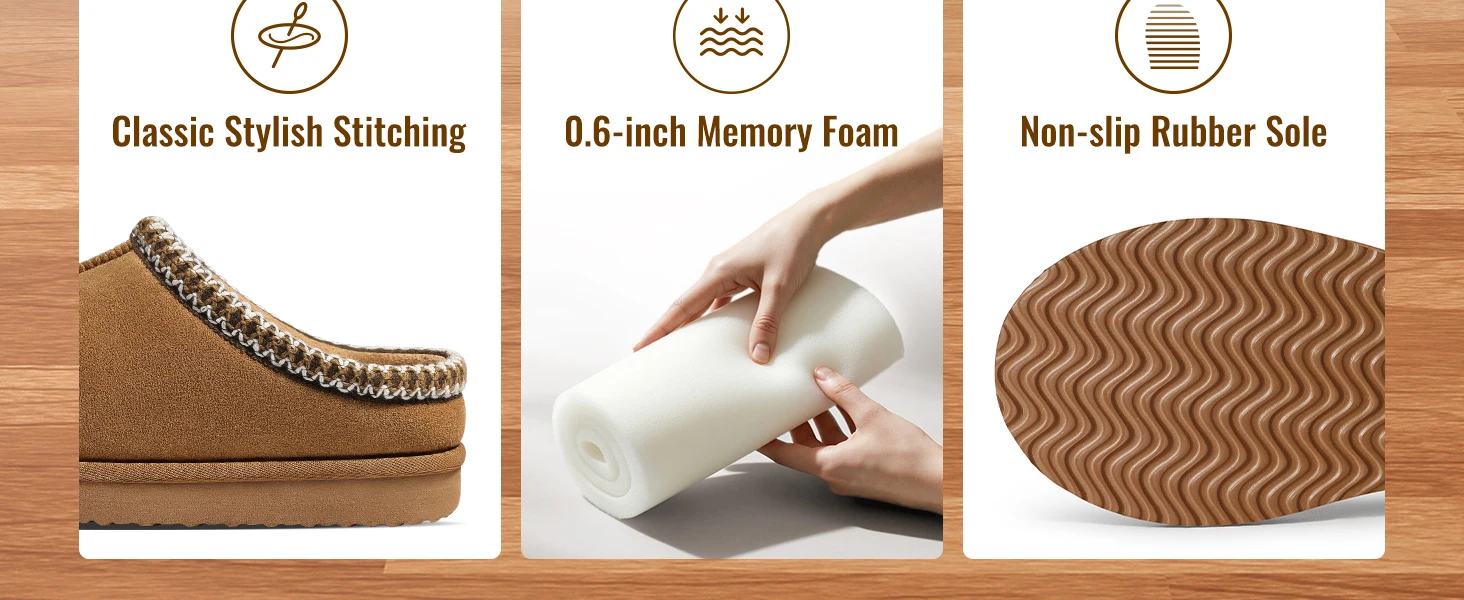 The interior is lined with soft shearling, complemented by a shearling insole for warmth and cushioning. The durable rubber outsole provides grip and stability on indoor surfaces, while the stitched construction and slight platform ensure long-lasting comfort and a snug fit for everyday use.