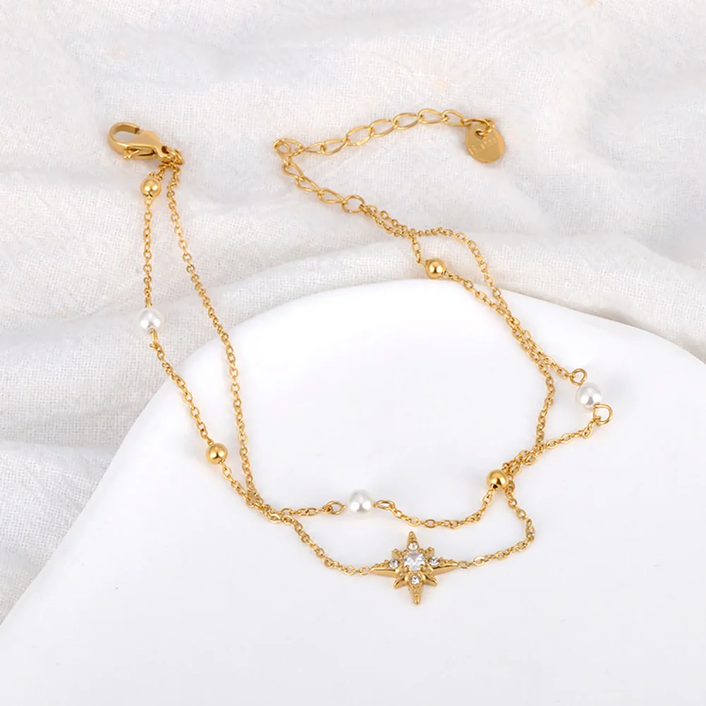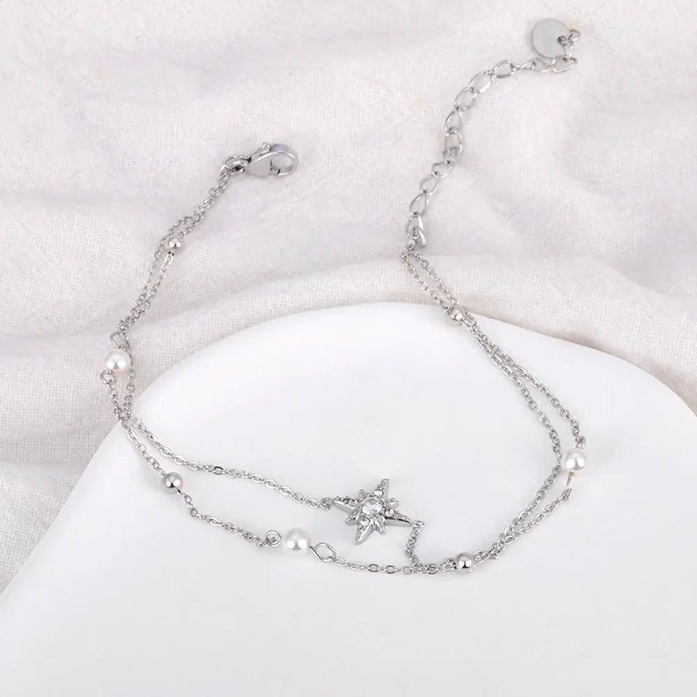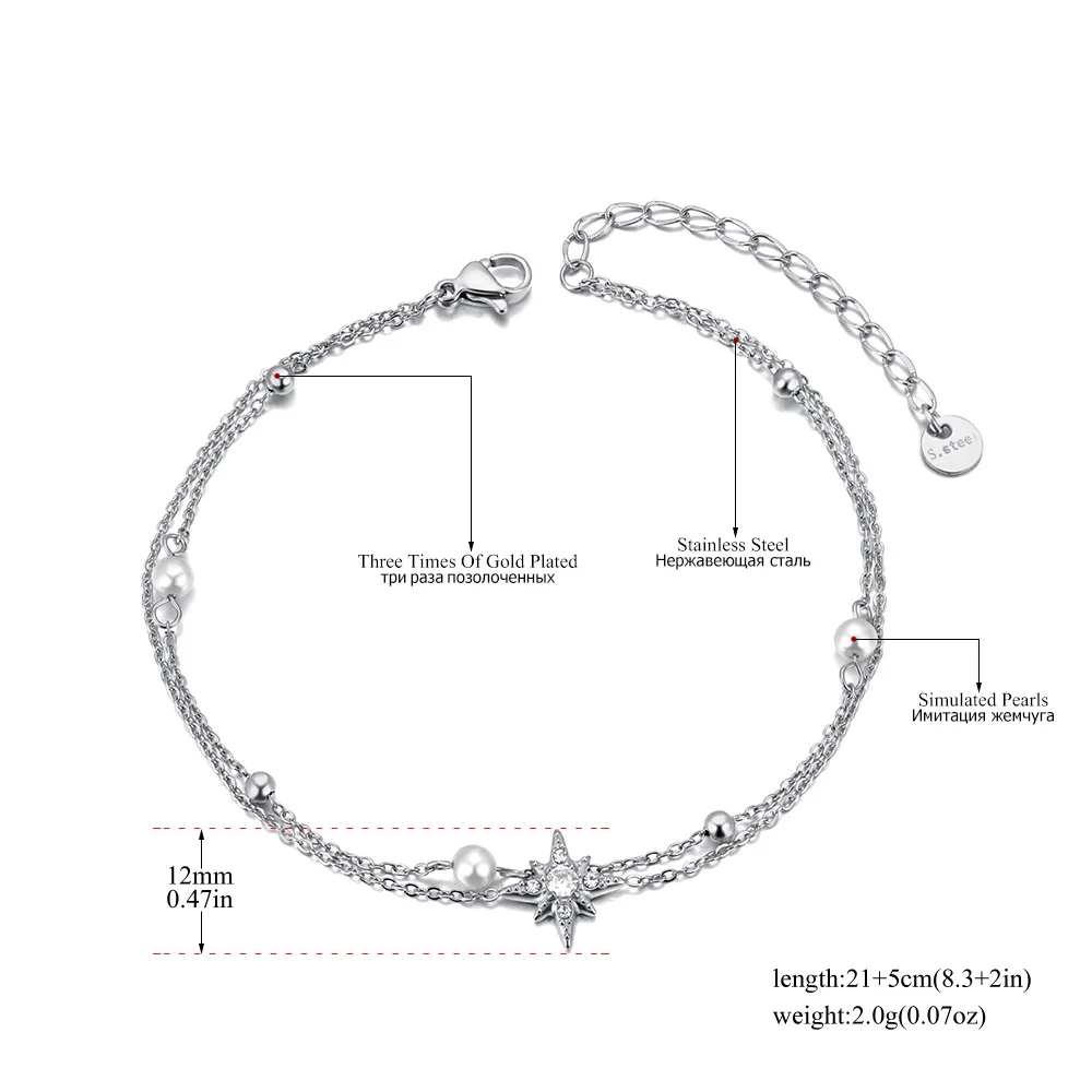 Lokaer Boho Double Layer White Pearl Chain Link Anklet For Women 316L Stainless Steel CZ Crystal Star Jewelry Ножные цепи A24018