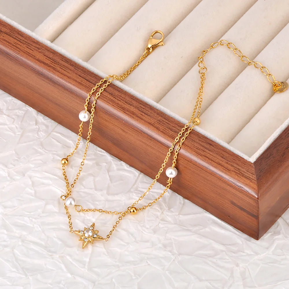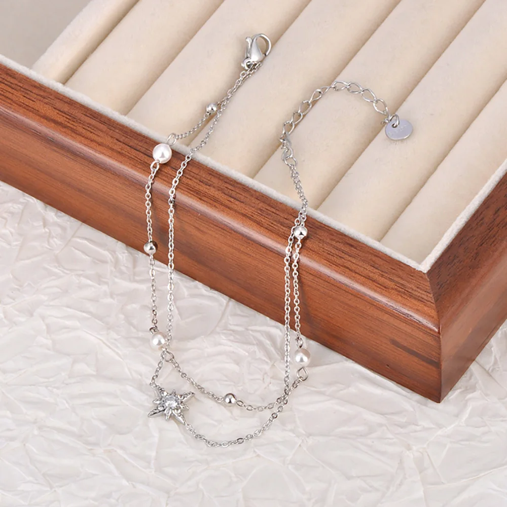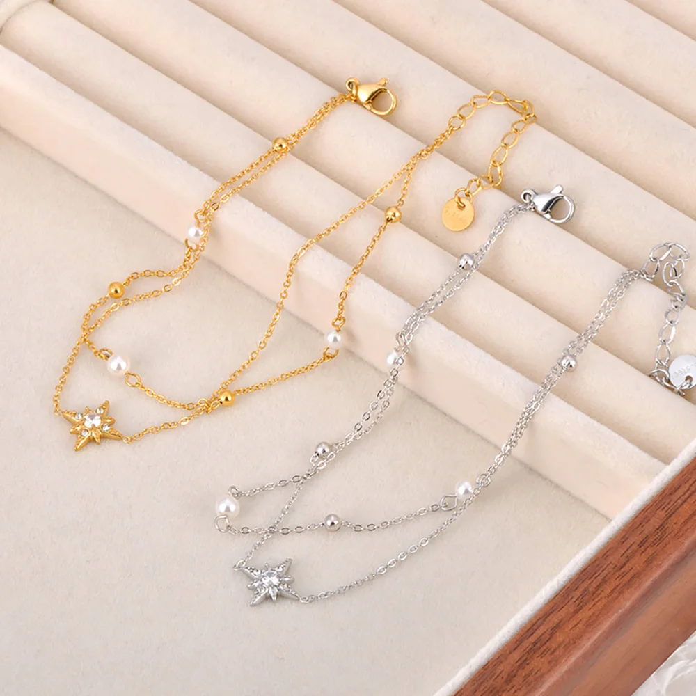Bohera- Lokaer Boho Double Layer White Pearl Chain Link Anklet For Women 316L Stainless Steel CZ Crystal Star Jewelry Ножные цепи A24018