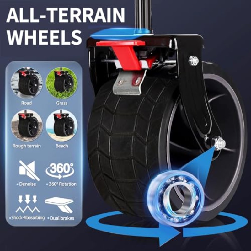 The metal frame's surface is designed to resist rust and corrosion, ensuring it remains durable and vibrant even with prolonged outdoor use. The cart features robust all-terrain wheels that are wider than standard options, measuring 10 cm in width, and include a braking system along with 360° rotation. These wheels are crafted from premium PU material with a special anti-slip design, providing flexibility and shock absorption, while the sturdy handle allows for easy maneuvering.