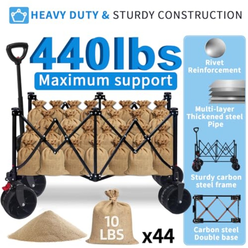 260L Heavy Duty Collapsible Utility Wagon | Foldable Garden/Beach Cart with 199.58KG Weight Capacity, Adjustable Handle, Mesh Cup Holder, and Brakes, Iron and Plastic Construction, No Electricity Required